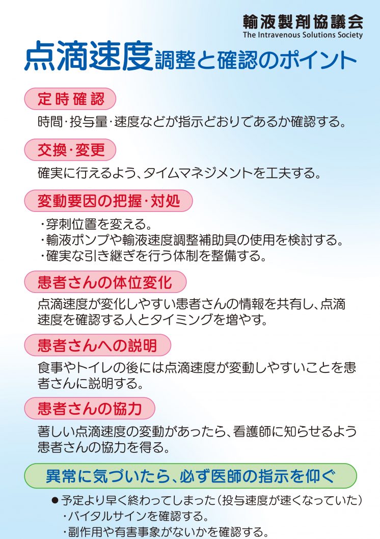 点滴速度の調整と確認のポイントをまとめたポケット資材です。