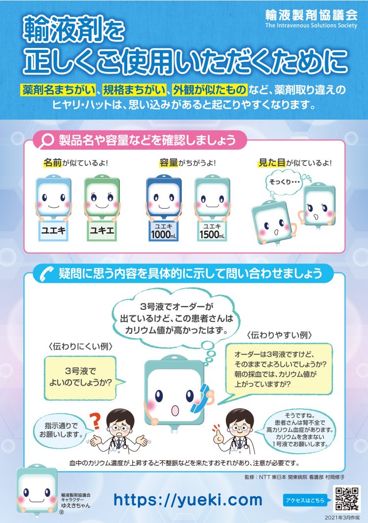 輸液製剤には、販売名と剤型表記、施用部位等の表示、バーコード表示の3つの安心が施されています。