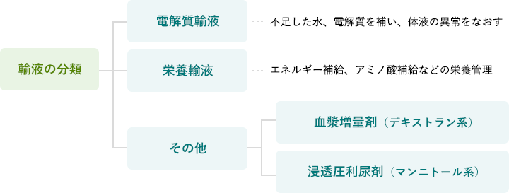 輸液を分類すると、電解質輸液、栄養輸液とその他(血漿増量剤等)の3つに大別できます。